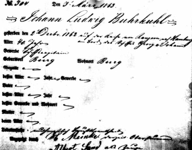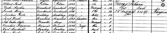 Johan Ludwig was a brother of Diederich Burkuhl (1810). Diederich had a son named Carl Johan Ludwig Burkuhl (1844), who was apparently enthused by his uncle's stories of all his adventurous sea voyages around the world and all the exotic countries he had visited. Carl Johan Ludwig, however, was already living in Hamburg at that time. In 1862, he signed on as a (Schiffs)Junge (Ship)man on the ship Georg & Johann, see below: