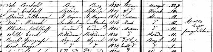 You see above that Johan is suddenly called Burkohl, but he lives in Burg and was born in 1822. You also see that at 25, he was already a helmsman aboard the ship Apollo. At the end of his "training," he was even promoted to captain. How this came about is unknown. However, he remained unmarried. Johann Ludwig was still a first mate in 1847, so sometime in the following years he was promoted to captain.