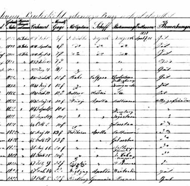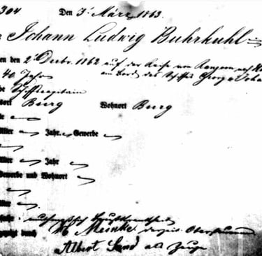 The Burkuhl family originated as a farming family. During the 19th century, technological developments led to the emergence of more and more new professions, requiring ever more people. It is therefore logical that the Burkuhl family also encountered these new occupations. Those living around Bremen were particularly affected. Diederich Burkuhl (1810), for example, was already mentioned as a sailmaker. A brother of Diederich, Johann Ludwig Burkuhl (1822), took the plunge and tried his luck in the seafaring industry. As we shall see, this adventure did not end entirely well. No birth certificate for Johann Ludwig could be found, but his father lived in Vorburgdam near Bremen. Later, Johan Ludwig himself would live on the other side of Bremen, namely in Burg. Next to this, you see a sign-on logbook from Johan Ludwig. These ships were all sailing ships at the time, but more and more were equipped with a steam engine to allow them to continue sailing when there wasn't enough wind. The names of these ships are also listed, as well as their captain: