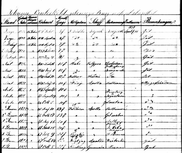 Johan Ludwig was born in 1822. He had already started working on a ship at the age of 15. As you can see, this was initially as a (shipping) young man, in 1837. At that time, you could advance in rank based on your good performance. You can see in the last column that this performance was usually good (Gut) and once satisfied (zufrieden). So he rose through ranks from ordinary seaman, seaman, second mate, to first mate. Below is an example of an enlistment list for the crew of the ship Apollo in 1847, where Johan Burkuhl, residing in Burg, is listed as a helmsman.