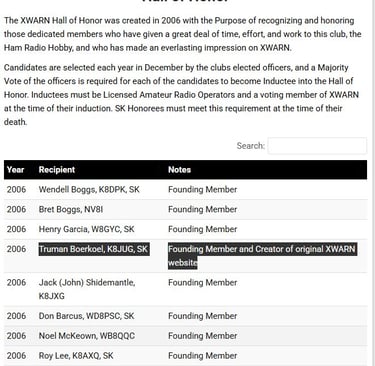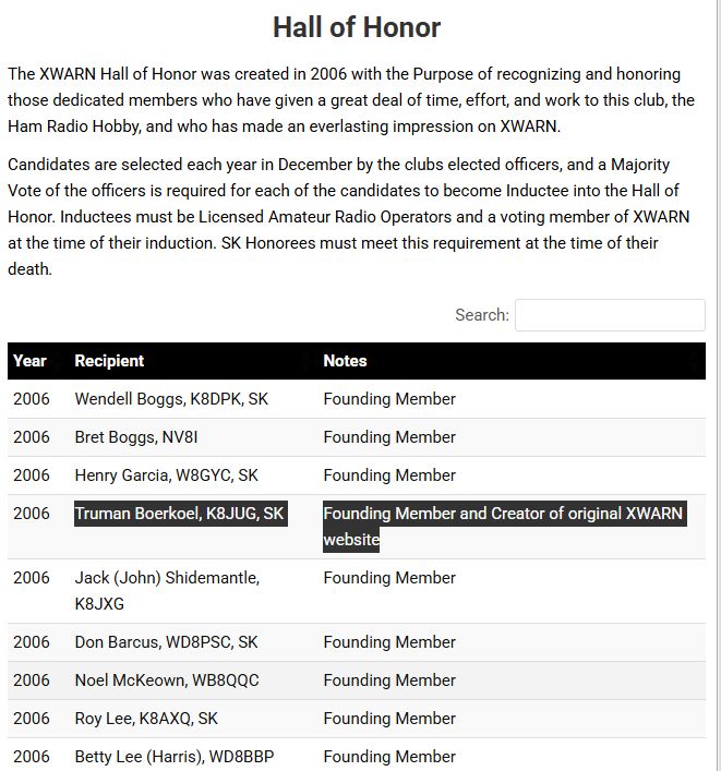 Truman Boerkoel also had electrical engineering as a hobby, as a radio amateur under the code name K8JUG. Due to the often great distances in America, the invention of radio communication was a wonderful means of communication. And so, associations and clubs soon emerged that worked together on building radio transmitters and developing all kinds of applications. Truman lived in Xenia, Ohio. One of the frequently major problems in his region there was the unpredictability of tornadoes at the time. Together with several other radio amateurs, he founded the organization Xwarn, with the aim of setting up an early warning service for the region that could warn of approaching tornadoes via radio. Xwarn means Xenia Weather Warningsystem. This turned out to work quite well, and Xwarn is still committed to this cause to this day, only in a slightly different and more extensive form than before. See their website https://xwarn.net . If you visit the website, you will still see Truman Boerkoel listed as an honorary member of the founders of Xwarn in the Hall of Honor.